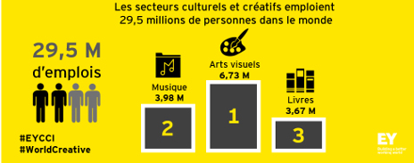The eleven sectors employ 29.5 million people or 1% of the global workforce, exceeding the number of jobs in the automotive industry in Europe, Japan and the United States. Visual arts, are once again in terms of cultural leauders jobs with more than 6.5 million jobs in the world.