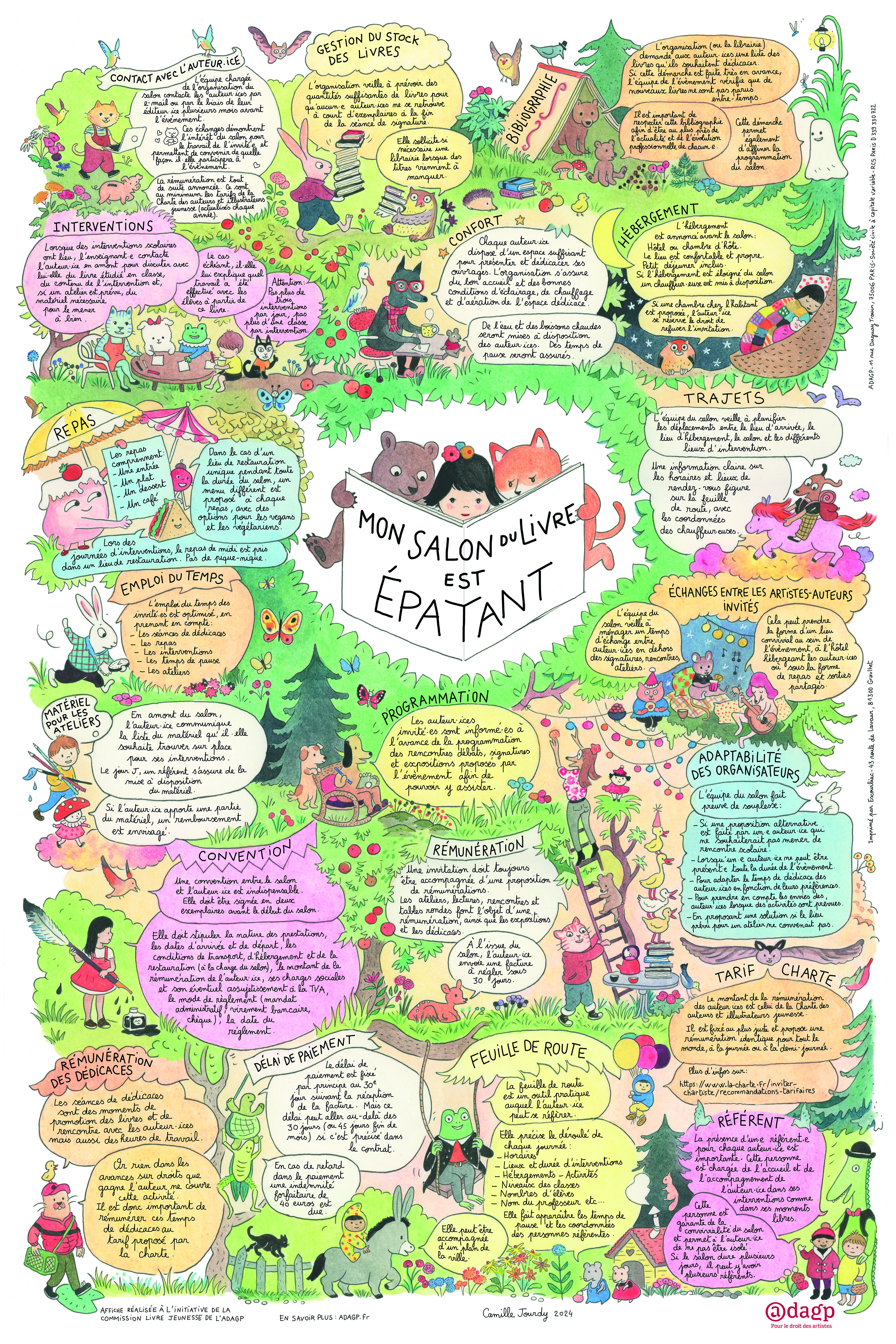 En lien avec le Label des Auteurs jeunesse, la commission Livre jeunesse a donné carte blanche à l’autrice Camille Jourdy pour créer l'affiche Mon salon du livre est épatant pour l'année 2025, afin de guider les manifestations littéraires concernant les attentes et les besoins des auteurs et autrices relatives aux conditions d’accueil.