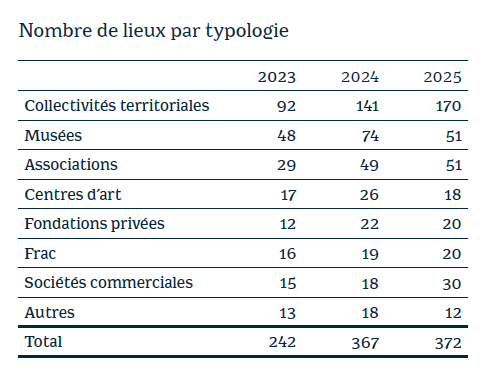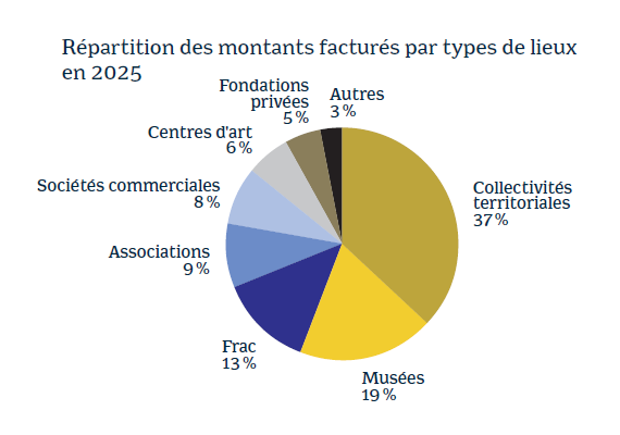 Les musées et les centres d’art sont moins nombreux à régler du droit d’exposition en 2025 qu’en 2024. Cette baisse est à relativiser car, pour plusieurs d’entre eux, ces droits sont pris en charge par les collectivités territoriales, les associations ou les sociétés dont ils dépendent et sont donc comptabilisés dans ces catégories. Seuls 2 Frac sur 22 ne paient pas le droit d’exposition. Côté sociétés commerciales, le nombre de celles qui s’acquittent de ce droit est passé de 18 à 30.