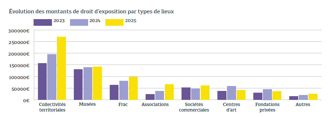 Le nombre de lieux qui paient du droit d’exposition se stabilise mais il est à noter que le montant moyen de droit d’exposition réglé par lieu progresse puisqu’il passe de 1 730 € en 2024 à 1 987 € en 2025.