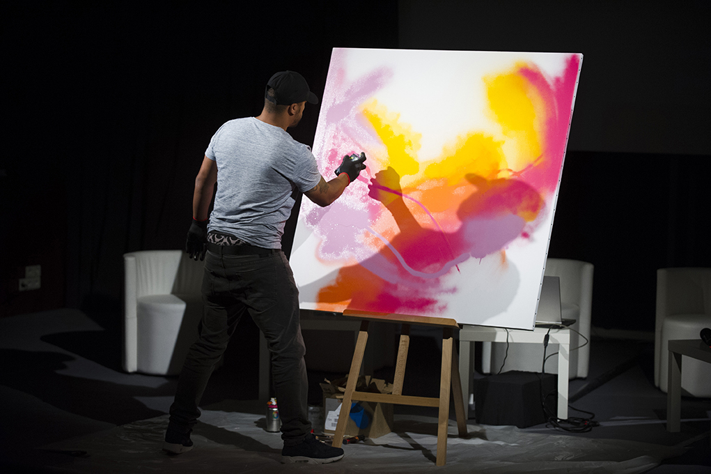 - l’artiste Babs, qui depuis ses 11 ans s’exprime par le graffiti, a proposé une performance en énergie et en couleurs, revisitant le thème du code barre ;