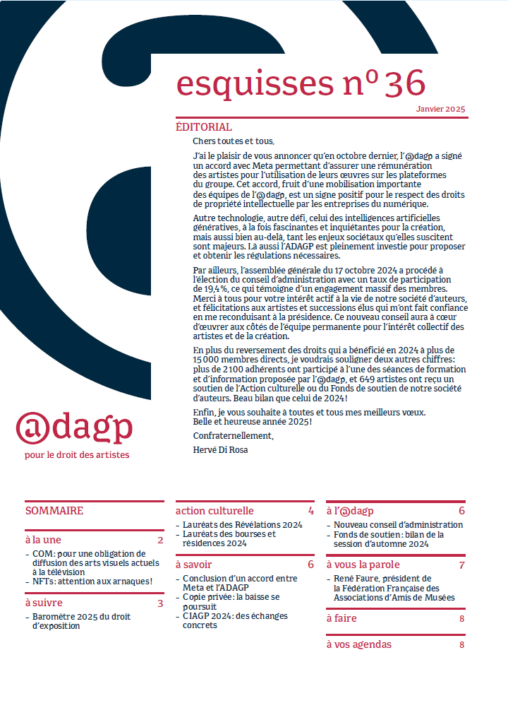 Tous les six mois, l'ADAGP édite sa lettre d'information esquisses. Retrouvez en janvier 2025 le n°36.