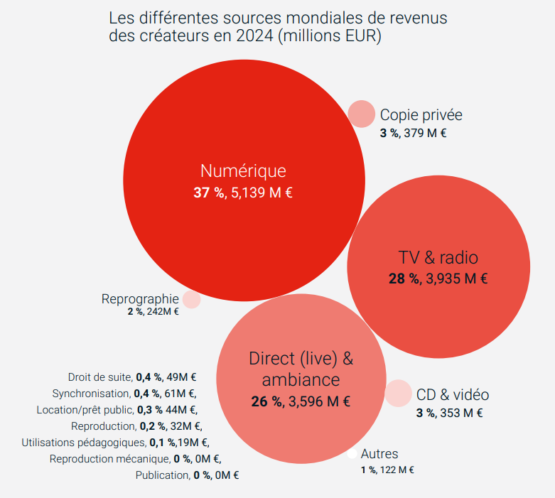 En 2024, les droits générés par les créateurs ont augmenté de 6,6 % au niveau mondial, pour atteindre le montant record de 13,97 milliards d’euros. Ce chiffre s’explique en grande partie par une hausse de 11,2 % des revenus du numérique, premier moteur de la croissance puisqu’ils représentent 37 % des revenus globaux. Les revenus du numérique ont dépassé les 5 milliards d’euros pour la première fois, un montant multiplié par 7 depuis 2015.