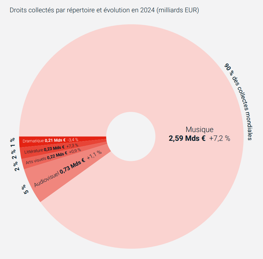 Le rapport sur les collectes mondiales de la CISAC, publié le 4 novembre 2025, montre que les droits d’auteur dans l’ensemble des secteurs de la création ont continué de croître en 2024. Une hausse qui s’explique notamment par la nette augmentation des revenus du numérique qui prennent une part de plus en plus importante dans les revenus globaux.