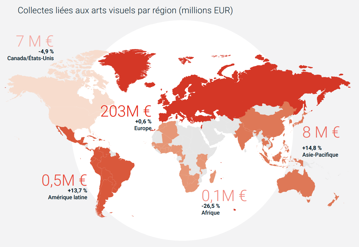 Plus de 90 % des revenus liés aux arts visuels ont été générés en Europe, avec une croissance de 0,6 %. Les deux tiers des revenus mondiaux viennent des 5 principaux pays contributeurs, que sont la France, l’Allemagne, le Royaume-Uni, la Suède et les Pays-Bas. La France continue à mener le secteur, avec 49 millions d’euros collectés en 2024, soit +2,9 % par rapport à 2023.