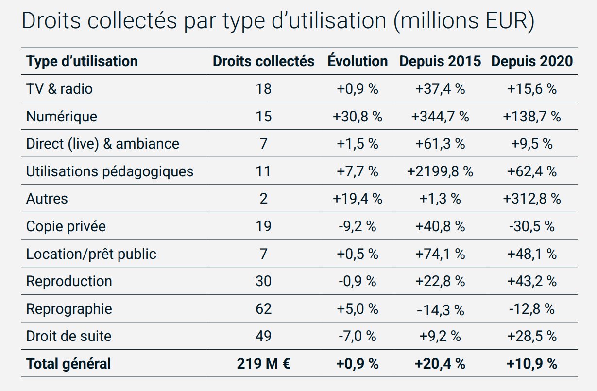 La reprographie reste centrale pour les arts visuels, avec 62 millions d’euros collectés en 2024, en légère augmentation de 5 % par rapport à 2023.